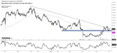 The stock started its decline in September 2024 from an all-time high peak of ₹130, eventually losing 47% of its value in nine months. Starting June 2025, it started trading with support of a rising trendline, and from September 2025, it has given a breakout from a rounding bottom.