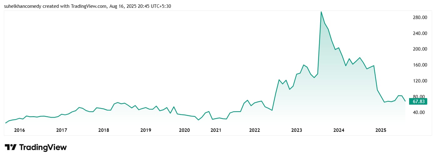 At the current price of Rs 68, the company’s share is trading at a discount of 78% from its all-time high of Rs 309.