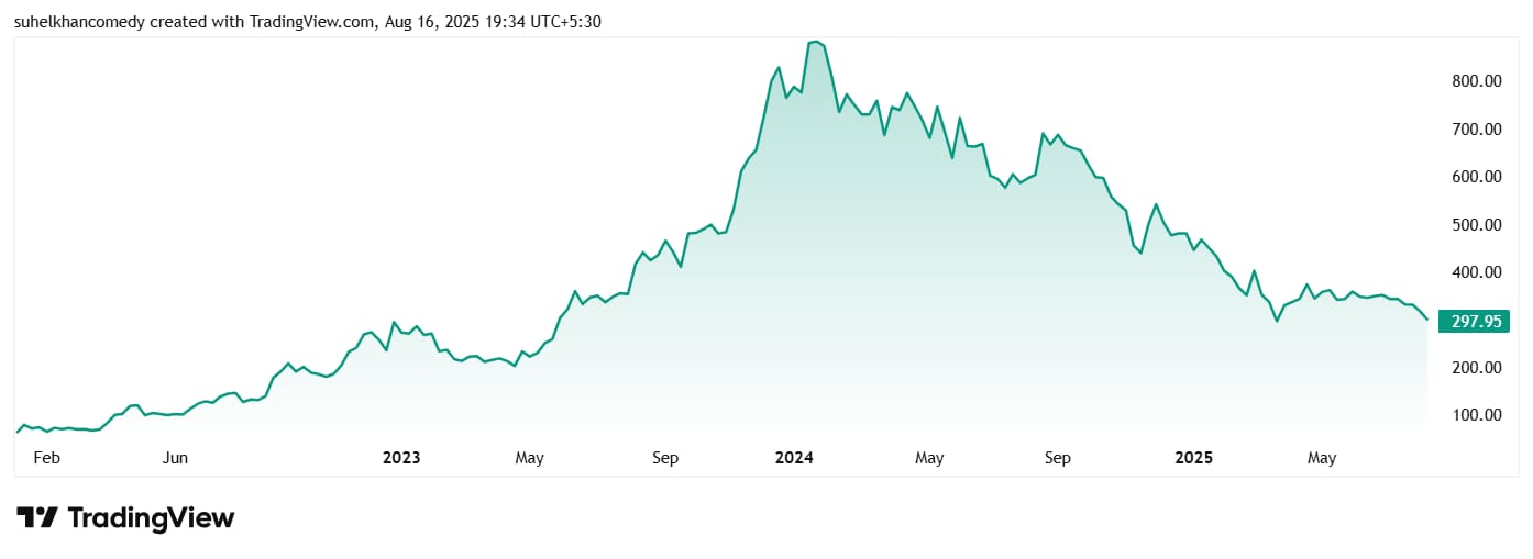 At the current price of 298, the stock is trading at a discount of 70% from its all-time high of Rs 966.