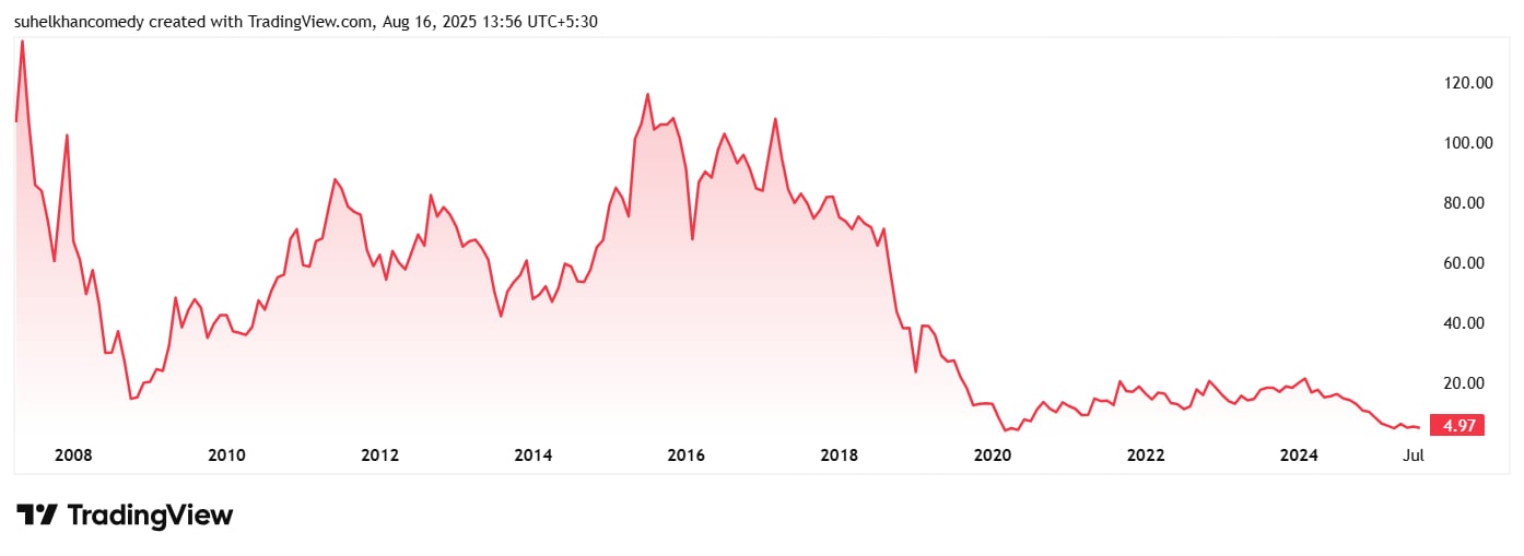 The share price of Dish TV India Ltd was around Rs 8 in August 2020, and as of closing on 14th August 2025, it was Rs 5, which is a drop of almost 38%.