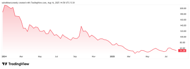 The share price of Dish TV India Ltd was around Rs 8 in August 2020, and as of closing on 14th August 2025, it was Rs 5, which is a drop of almost 38%.