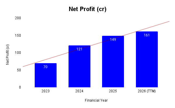 Profitability improved as the company scaled. The profit grew at a compounded rate of 58% over the last three years (FY22 to FY25), while the return on equity was 14%.