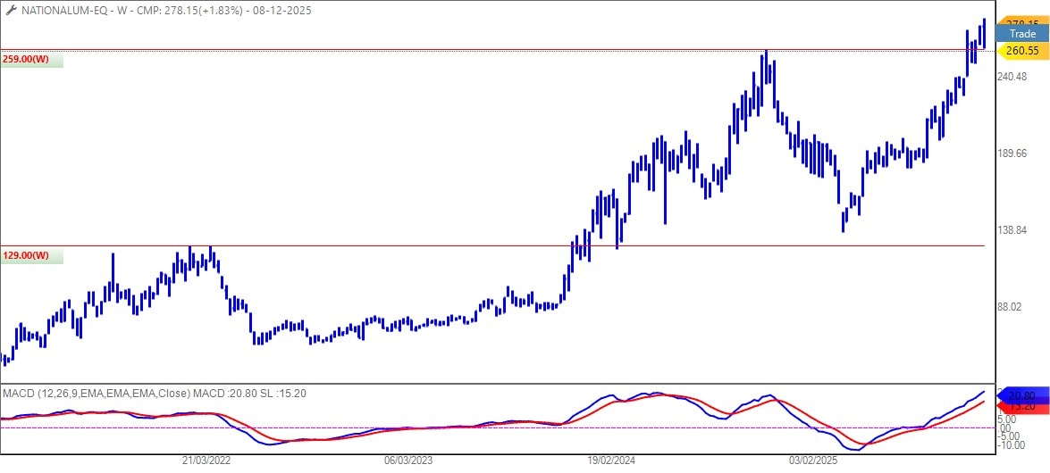 The share price movement of National Aluminium is similar to Hindalco and Vedanta. The stock has been making a higher base over time on the weekly chart, which means that investors are getting more convinced with the breakout at Rs. 260.