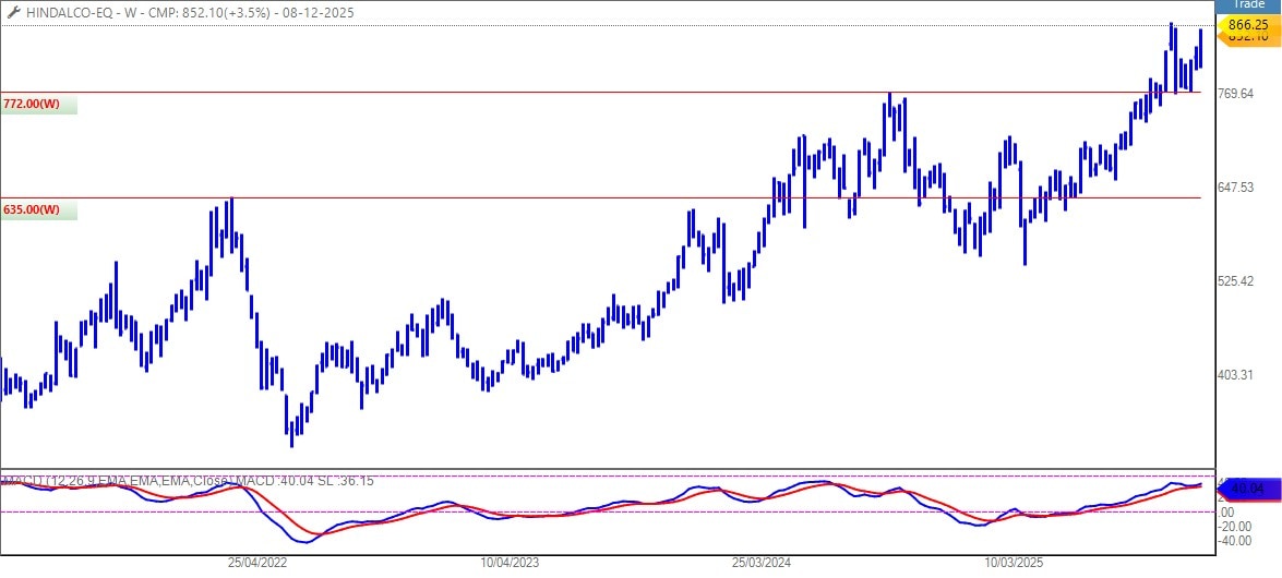 The MACD indicator is also strong, which backs up the rise in prices and suggests that momentum is growing. If the overall trend in metals goes as planned, Hindalco could probably reach the psychologically important Rs. 1,000 mark in 2026.