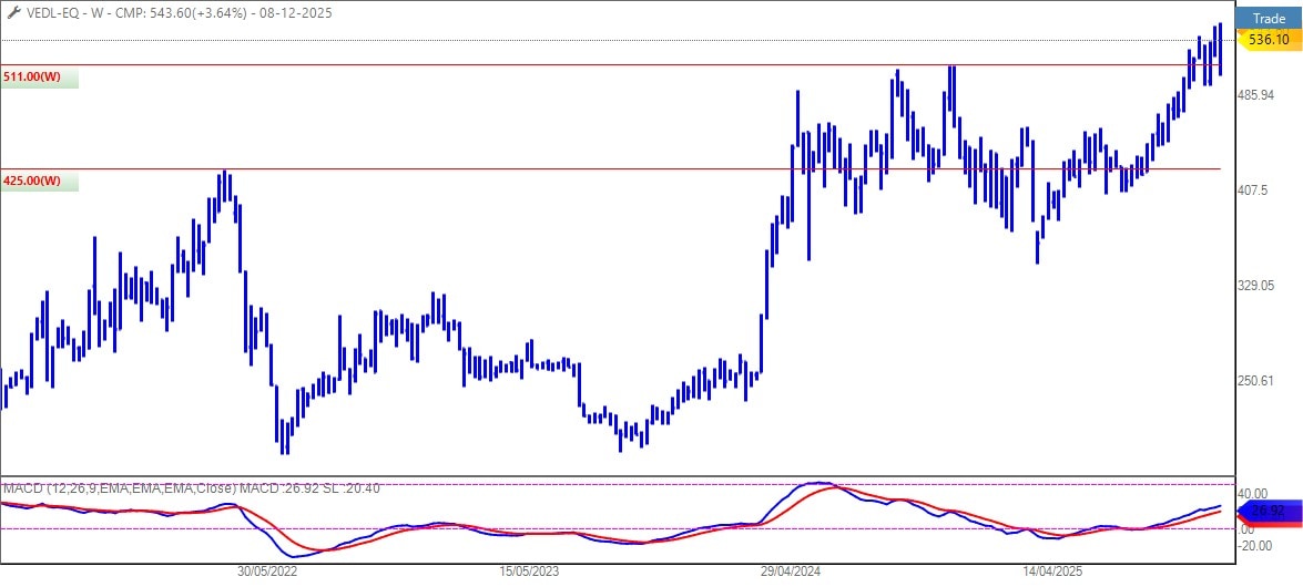 After breaking out above Rs. 400 in 2024, Vedanta share price spent a lot of time building a base between Rs. 350-480. This consolidation was the base for accumulation. The breakout above Rs. 500 shows that a new trend has started.