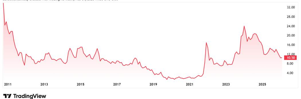 The share price of Orient Green Power Company Ltd was around Rs 2 in February 2021 and as on 9th February 2026 it was Rs 11, which is a 450% jump in 5 years.