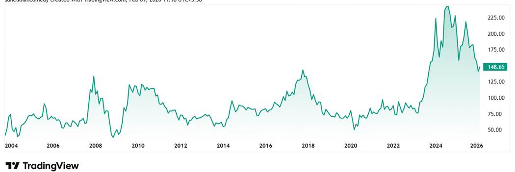 The share price of Gujarat Industries Power Co Ltd was around Rs 77 in February 2021 and as on 9th February 2026 it was Rs 149.