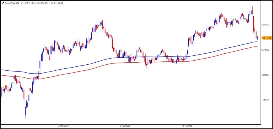 Reliance Industries is currently above the 200-day Exponential Moving Average (200 DEMA) channel on the daily chart. This channel has been a support in the past. This average has protected against drops and helped new rallies get started time and time again.