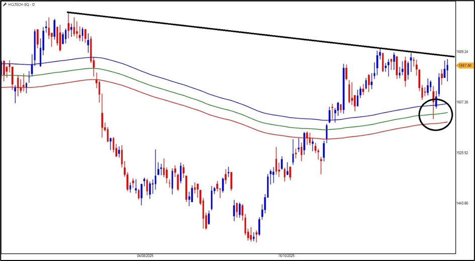 On the daily chart, the stock price of HCL Tech is outperforming the Nifty IT index and Nifty50. The reversal from the 200DEMA band of High, Low and Close signifies the strength in the trend.