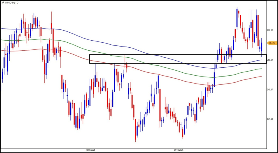 On the daily chart of Wipro, the market retested the breakout from the three months consolidation zone.