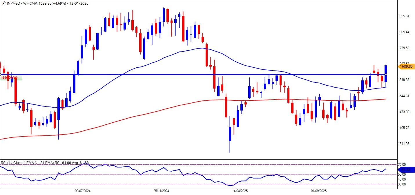 Infosys has made a clean, textbook move on the weekly chart. The stock broke out of an ascending triangle, which means that the long period of consolidation is finally over and the bulls have won.