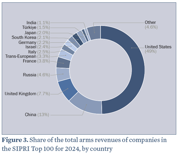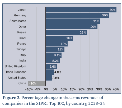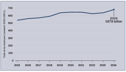 This implies a 5.9% year-on-year growth in real terms, and a 26% rise over the decade spanning 2015-24. This overall increase was primarily driven by rising arms revenues for companies based in Europe and the United States, as governments globally ramped up arms procurement amid rising geopolitical tensions.