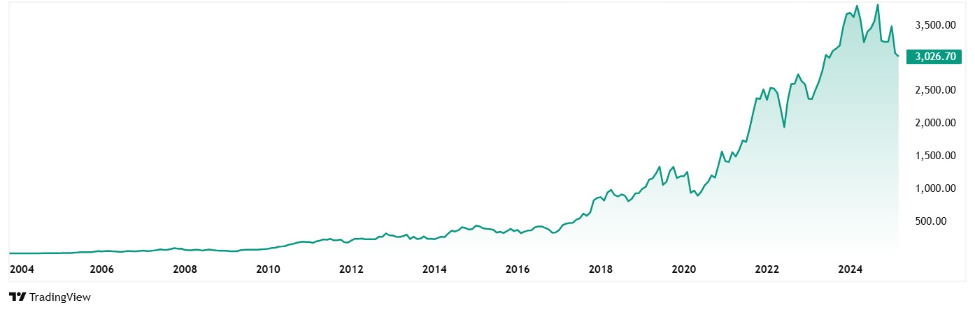 The share price of Titan was Rs 3,027 as of the closing on 10th March 2025, which is just a tad bit higher than its 52- week low of Rs 3,017. Here is how the share price has moved in the last decade: