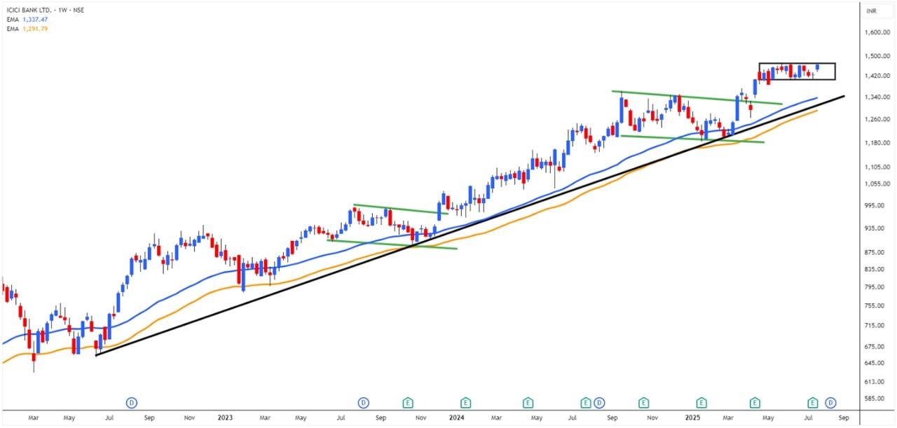 On the weekly chart, the stock is maintaining a Higher High – Higher Low structure, indicating a bullish trend in line with Dow Theory. Considering the chart pattern, the series of multiple bullish breakout patterns confirms the potential strength of the ongoing uptrend.