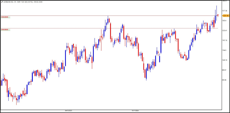 • Axis Bank is currently in the lead, trading at new highs with clear momentum.