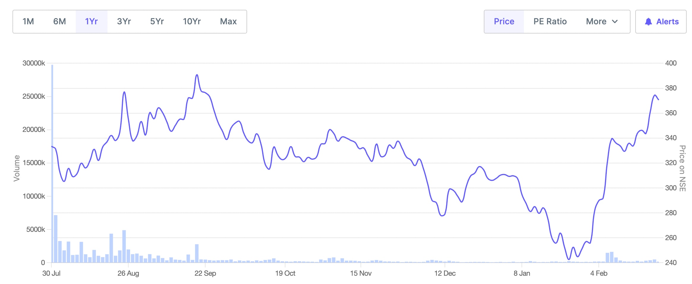 At the current price of around Rs 370, the stock trades at a price to earnings ratio of about 40 times.