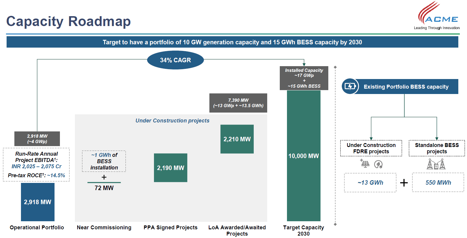 Acme is targeting 10 GW of generation capacity and 15 GWh of BESS capacity by 2030. They will be tied to 15-year service agreements with their BESS vendors. These agreements include an annual maintenance fee and mandate on-ground personnel and reserves to guarantee specified availability and round-trip efficiency.