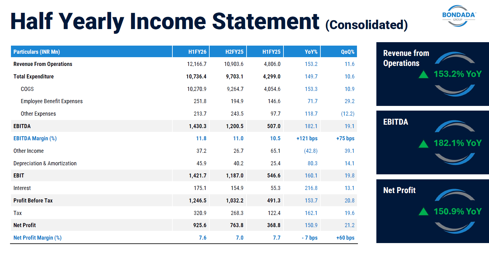 Now coming to its financial performance, revenue increased by 153% year-on-year to ₹12.2 billion in the first half of FY26. In the revenue mix, about 78% revenue came from renewable energy, followed by telecom (14%), and product manufacturing (8%). EBITDA increased by 182% to ₹1.4 billion, driven by operating leverage, while margin rose 121 bps to 11.8%. PAT, on the other hand, rose by 150.9% to ₹926 million.
