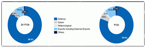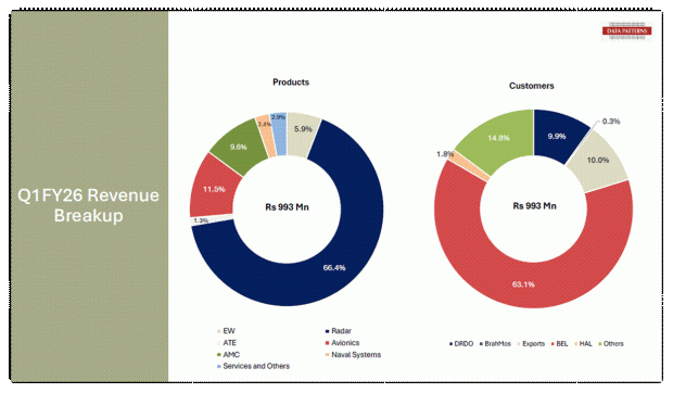 Radars contributed 66.4% to revenue in Q1FY26, making it the largest revenue driver. By customer mix, Bharat Electronics accounted for 63.1% of revenue, followed by exports (10%), DRDO (9.9%), Hindustan Aeronautics (1.8%), and others (14.8%).