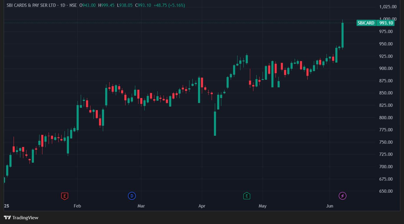 SBI Cards, India’s only listed credit card player, rose 5% on Friday to reach its 52-week high of Rs 999.45. The stock rose after the Reserve Bank of India cut the repo rate by 50 basis points. This will lead to a lowering of credit costs for credit card issuers.