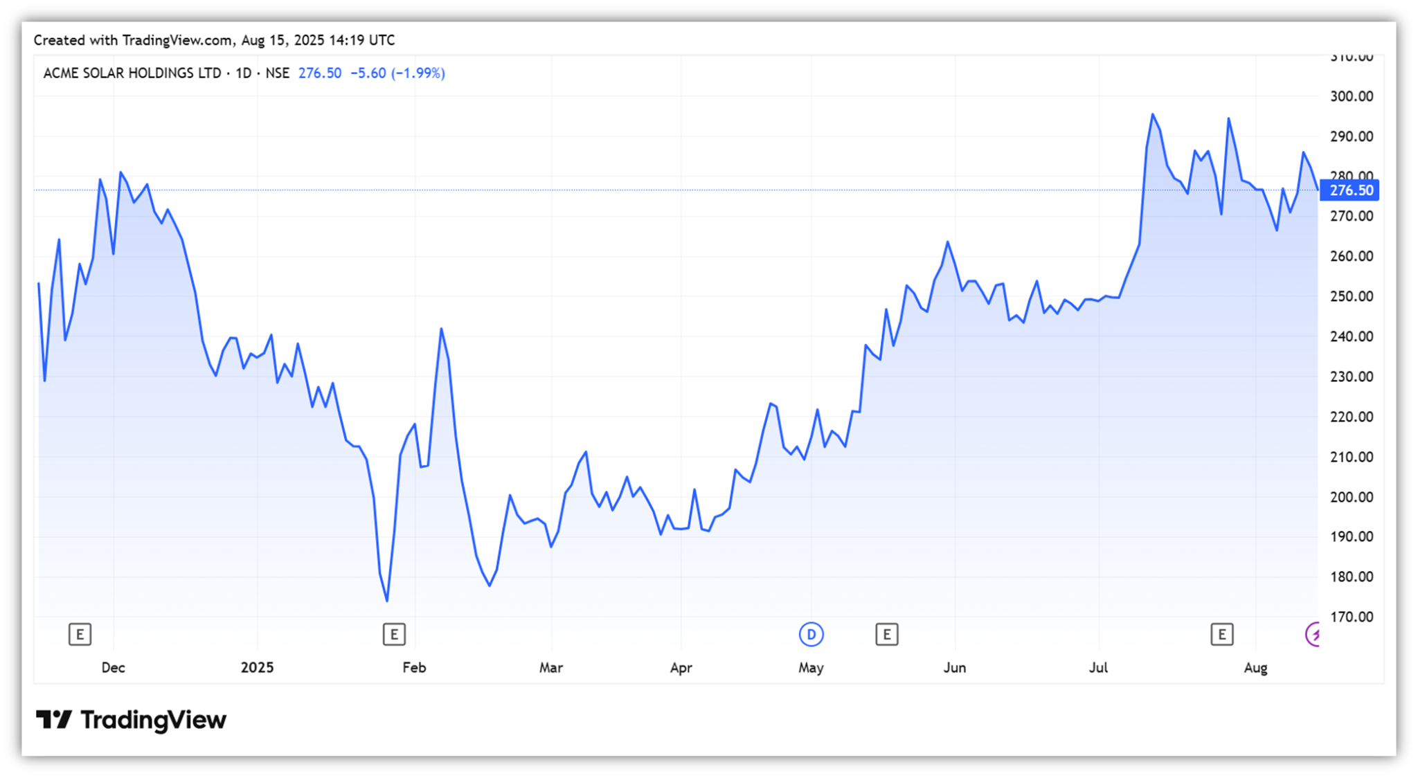 From a valuation perspective, Acme is trading at a P/E of 41x, which is higher than Tata Power (30x). Being a recent listing, the stock lacks sufficient trading history for meaningful historical comparisons.