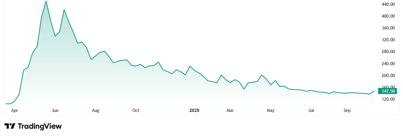 The company was listed in March 2024 at a share price of about Rs 103, which has jumped to Rs 151 as on 10th October 2025. That is a jump of almost 47% since listing. But as is evident from the chart below, the share price is sharply down from its highs.