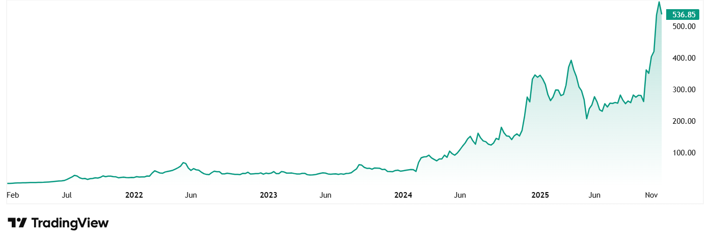 The share price of One Global Service Provider Ltd was around Rs 2 in December 2020 and as on 3rd December 2025, it was Rs 530, which is over a 26,000% jump in 5 years. Rs 1 lac invested in the stock 5 years ago would have been Rs 2.65 cr today.