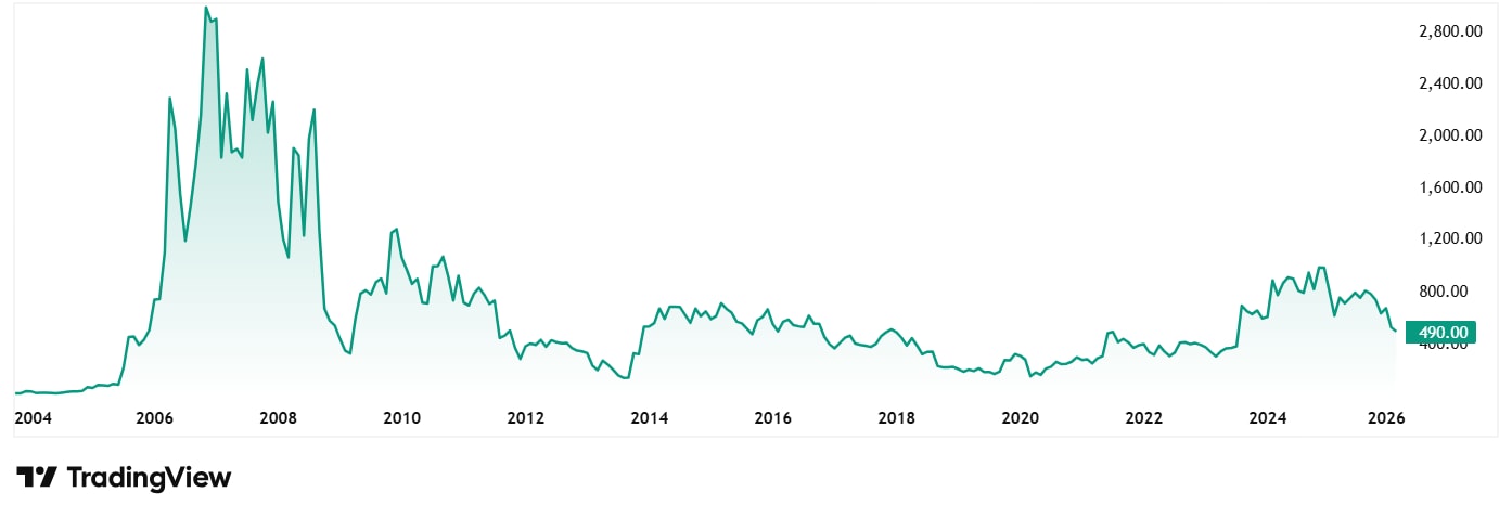 The share price of BF Utilities Ltd was around Rs 275 in February 2021 and as on 25th of February 2026 it was Rs 490. This current price is however over an 80% correction from its all-time high of Rs 2,628. In fact, the stock has corrected by over 43% just in the last 6 months.
