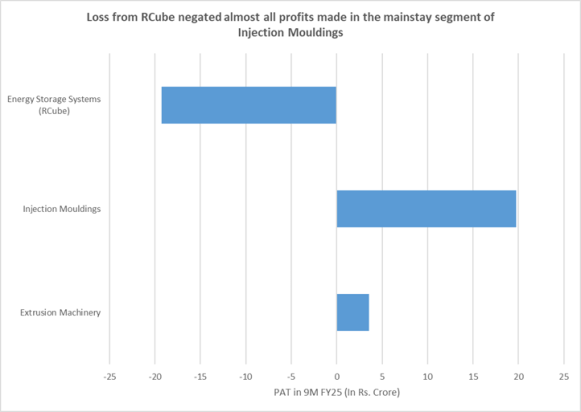 Furthermore, one of its subsidiaries in Italy, Wintal Machines, has filed for voluntary liquidation. Another of its subsidiaries, RCube Energy Storage Systems, saw its net worth get slashed from Rs.19 crore to Rs.47 lakh due to a critical project being abandoned. On the consolidated financials of Windsor, this reflected as a loss of Rs 19 crore in the 9 months ending December 2024. This negated almost all of the profits made in its mainstay segment of injection moulding.
