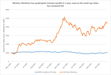 While the broad small-cap index has remained flat over the past one year, Windsor Machines has more than quadrupled investor wealth during the period. It has delivered a whopping 350% return since May 2024. Over the last 5 years, the return has been even more phenomenal at 3,000%.