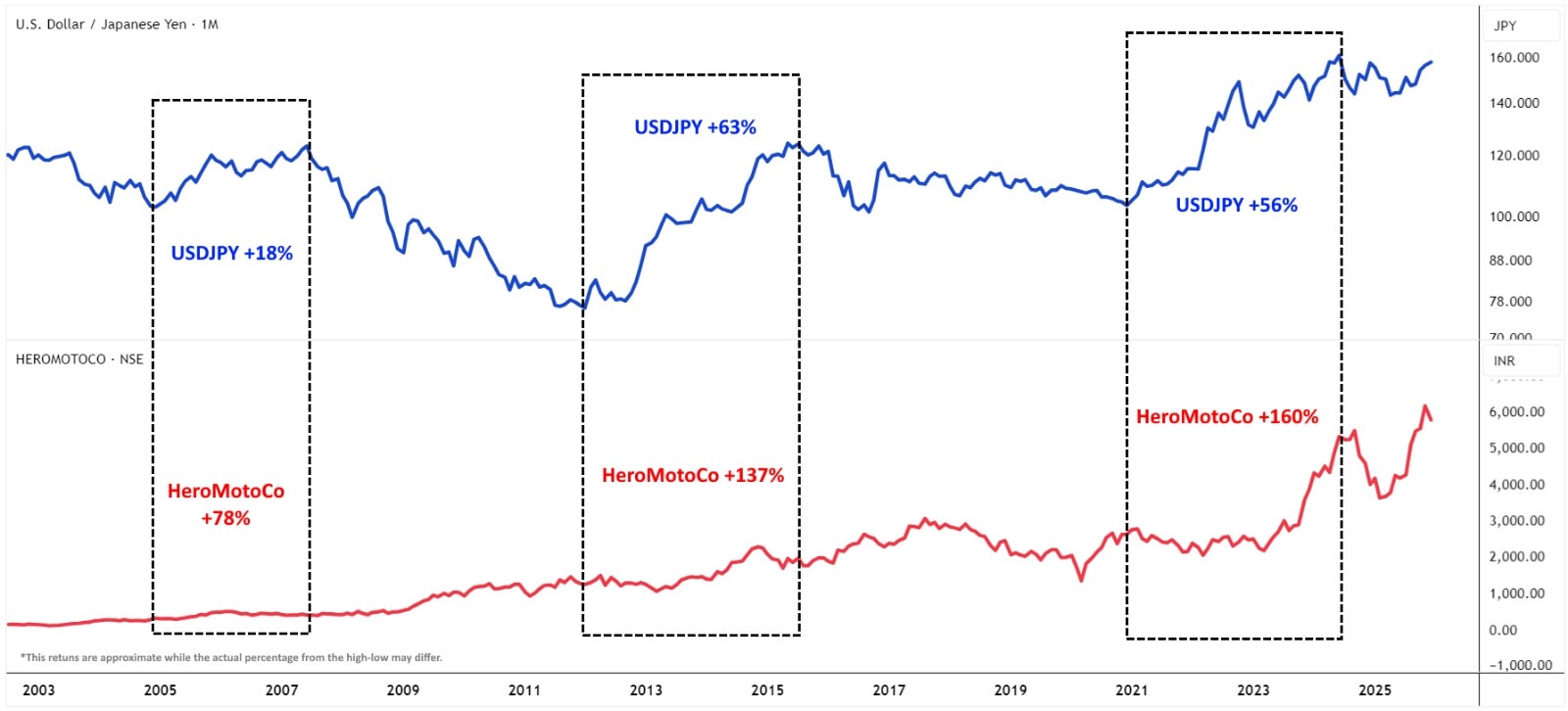 Hero MotoCorp may operate in a different segment, but the currency impact is similar. Japanese technology has been central to its journey (even though its JV with Honda ended years ago). And during phases when the Yen weakened, Hero’s stock performance reflected that advantage.
