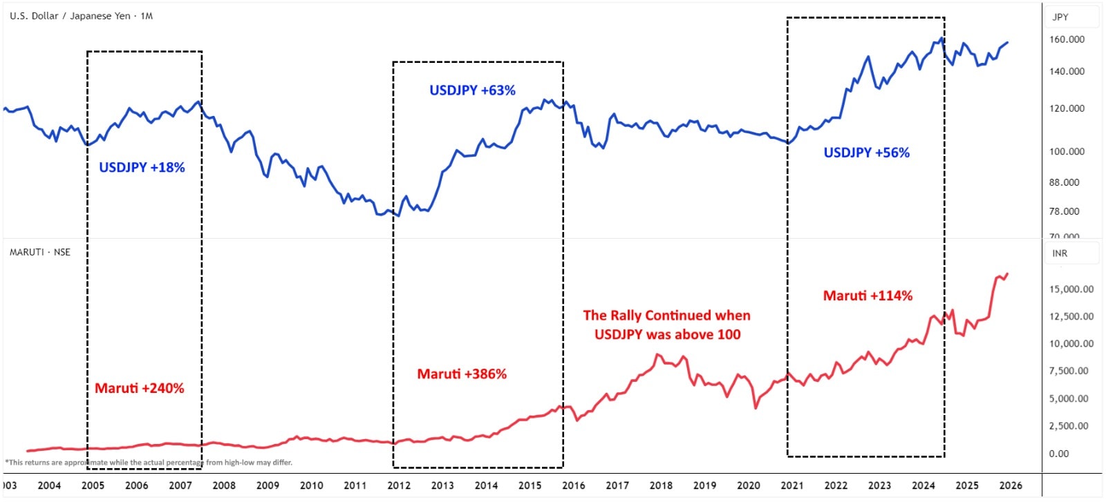 If you go back and study Maruti Suzuki’s long-term chart alongside phases of Yen depreciation, a pattern becomes hard to ignore. Whenever USDJPY stayed in a sustained uptrend, Maruti rewarded patient investors.