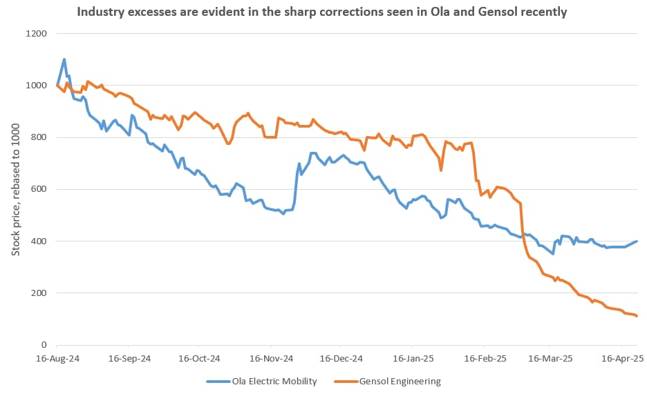 Finally, let’s talk about the megatrend that’s been the centre of contention – climate change. Even as some governments opt out of climate-change initiatives, India has been going full throttle. Be it solar or nuclear or EV, the Indian government has stepped up its PLIs and has even kicked off design-linked initiatives. Capital had also been flowing freely in the industry with both, VC/PE funds and IPOs drawing in investor capital. But from the looks of it, this has led to “excesses”, to put it lightly. Be it the fund diversion towards personal use at Blusmart/Gensol or the invoicing issues at Ola Electric, the rot in the industry is now being brought to the fore as competition from incumbents intensifies. Gensol Engineering and Ola Electric have eroded about 85% and 50% of investor wealth since recent highs.