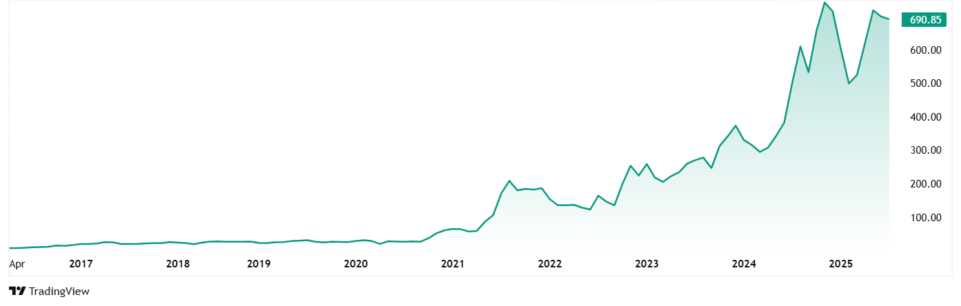 The share price of Raghav Productivity Enhancers Ltd went from Rs 24 in July 2020 to its current price of Rs 692 as of closing on 8th July 2025, a jump of 2,783%. Rs 1 lac invested in the stock 5 years would have been almost Rs 29 lacs today.