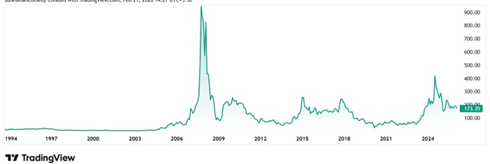 The share price of Walchandnagar Industries was around Rs 64 in February 2021 and as of closing on 20th February 2026 it was Rs 173.