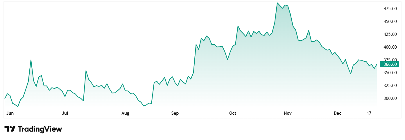 The share price of Unified Data-Tech Solutions was around Rs 300 at listing in May 2025 and as on 22nd December 2025 it was Rs 367. At the current price, the share is trading at a discount of over 25% from its all-time high price of Rs 495.