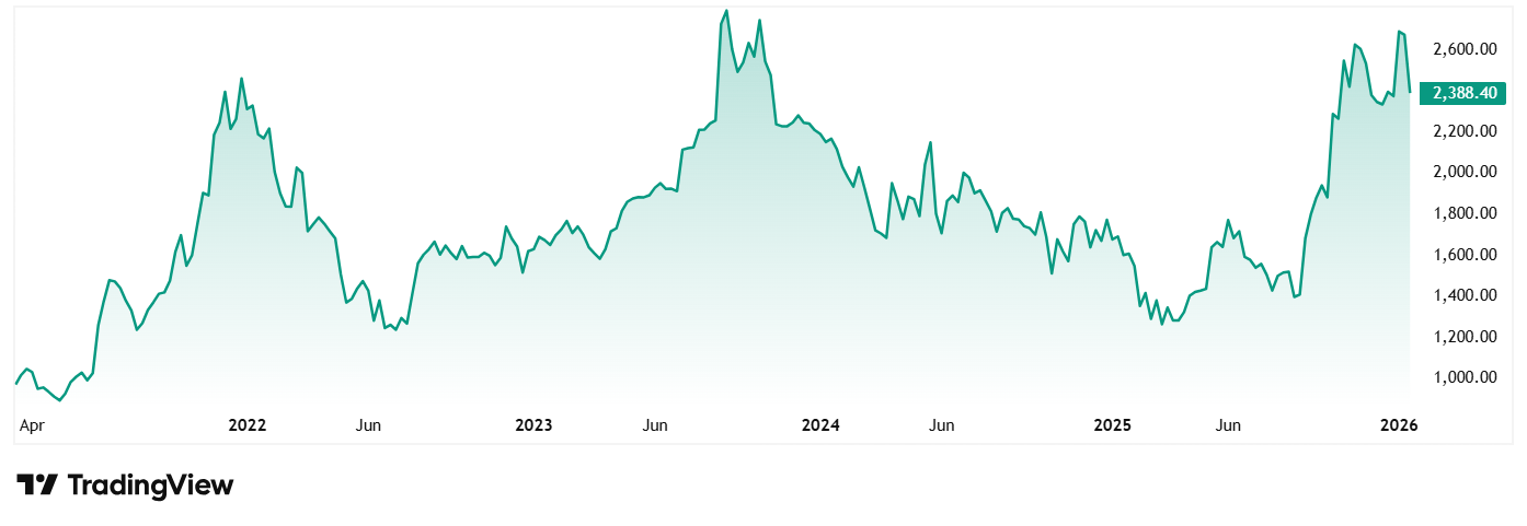 The share price of MTAR Technologies was around Rs 970 when listed in March 2021 and as of closing on 23rd January 2026 it was Rs 2,400. This is a 147% jump in about 5 years.