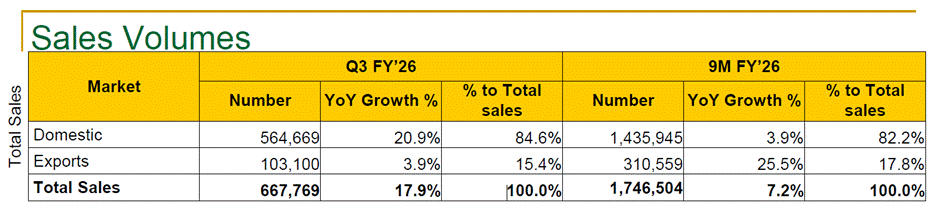 Maruti exported 3.9% more units year-on-year in Q3FY26, totaling 103,100 units, representing 15.4% of total sales. In Q3FY26, export revenue stood at ₹8,200 crore, accounting for 16.4% of total revenue. In the 9MFY26, exports recorded a 25.5% year-on-year increase to 310,559 units, accounting for 17.8% of total sales.