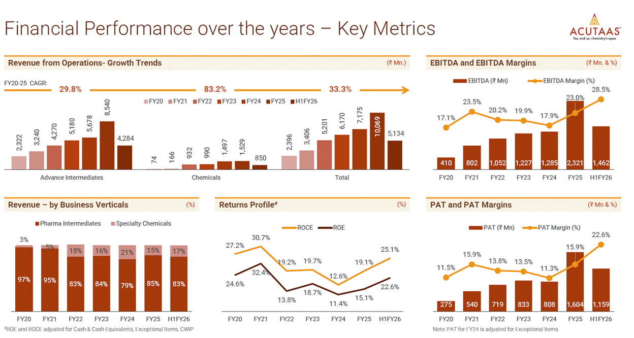 Coming to its financials, revenue increased 21% year-on-year to ₹513.4 crore in the first half of FY26 (H1 FY26), driven mainly by the API vertical. EBITDA (Earnings before interest, taxes, depreciation, and amortization) increased by 86% to ₹146.2 crore, while the margin expanded by 900 basis points (bps) to 28%. Profit after tax (PAT) surged by 122% to ₹115.9 crore.