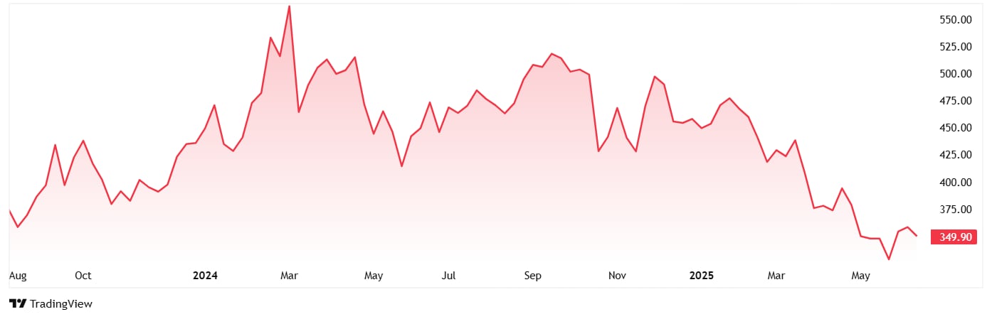 The share price of NIIT Learning Systems Ltd was around Rs 375 at listing in August 2023 and as of 19th June 2025 it had dropped to Rs 350, which is close to its 52-week and all-time low price of Rs 323.