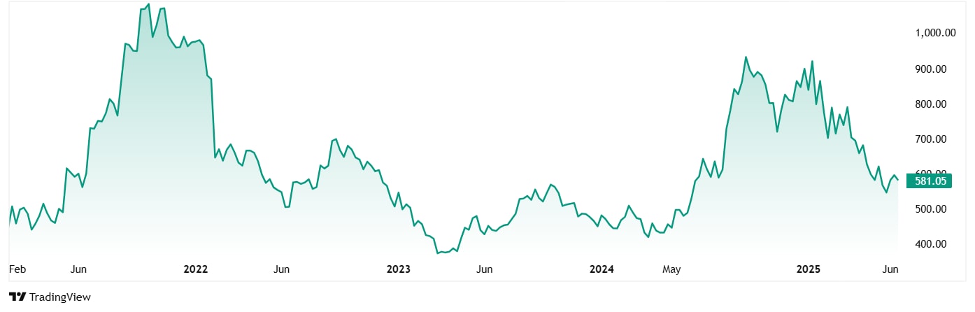 The share price of Stove Kraft was around Rs 445 at listing in February 2021. As of 19th May 2025, the price was Rs 583, which is closer to its 52-week low price of Rs 525.