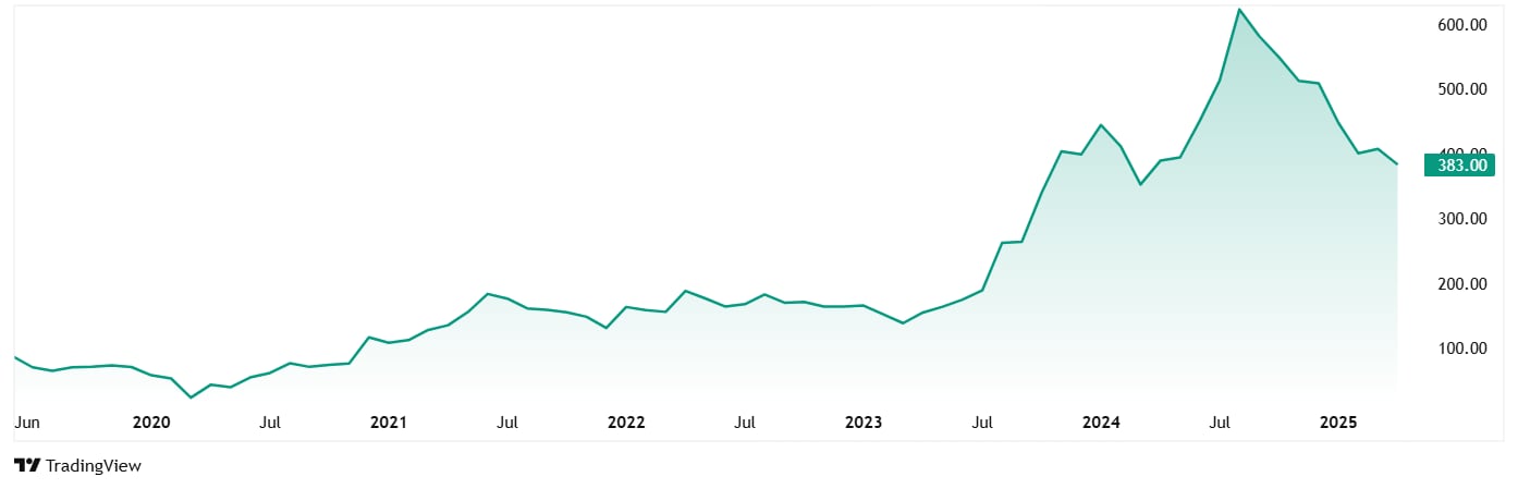 The current share price of Prakash Pipes is Rs 382 as on closing of 9th April 2025, which is a jump of about 1,265% from Rs 28 in the last 5 years.