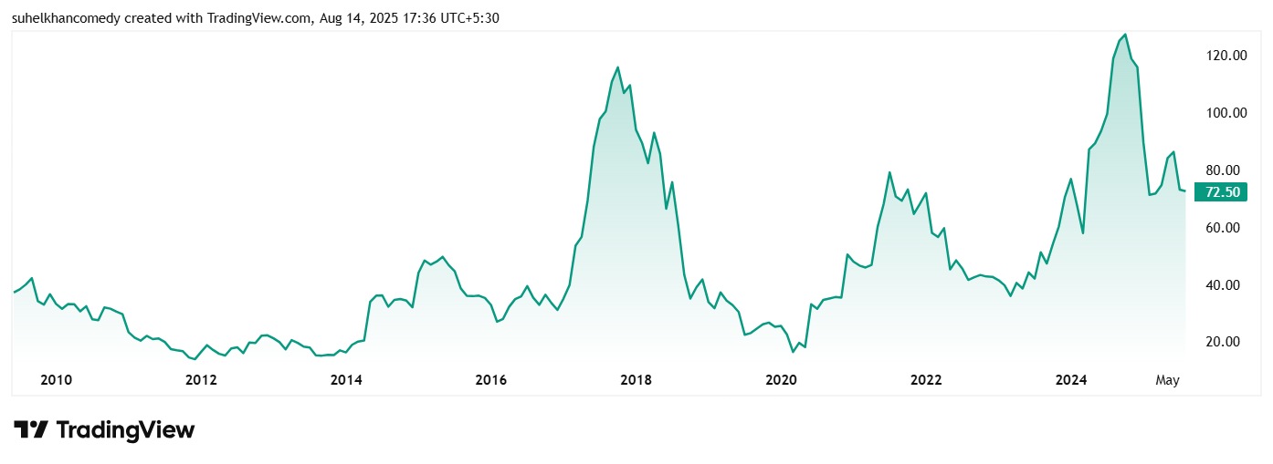 The share price of Geojit Financial Services Ltd was around Rs 35 in August 2020, and as of closing on 14th August 2025, it was Rs 72.5, which is a jump of 107%.