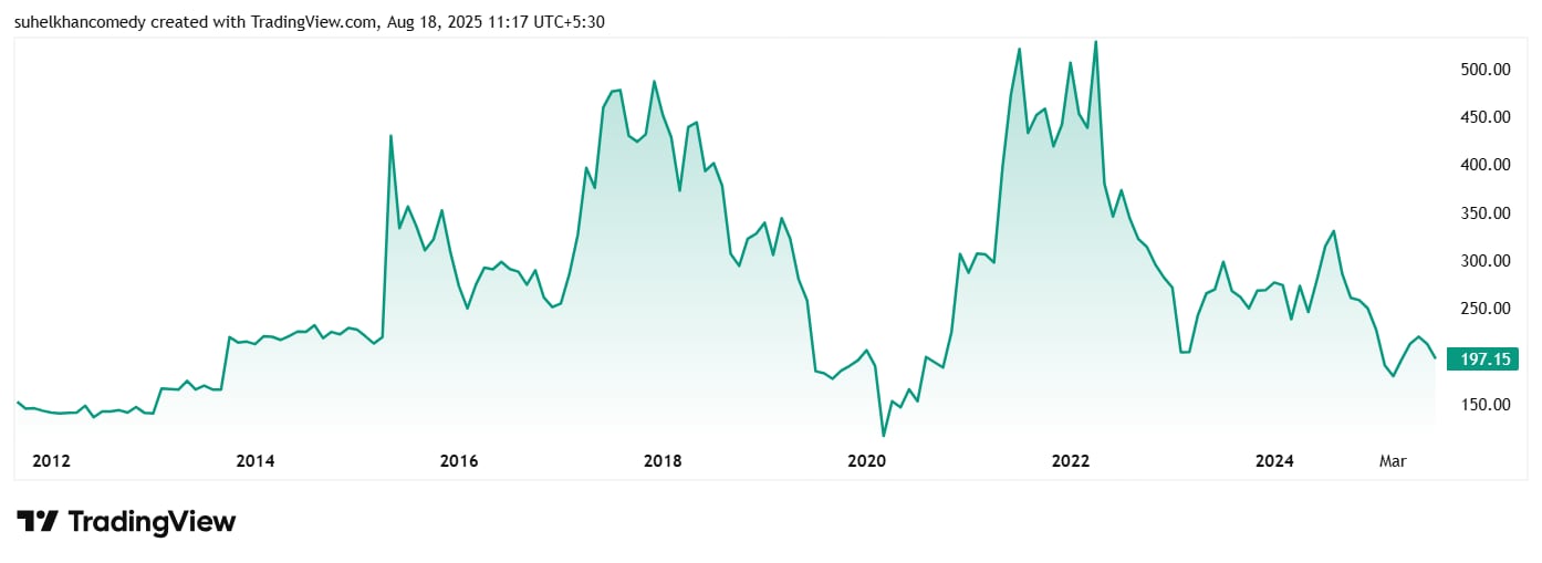 The share price of Rupa & Company was around Rs 203 in August 2020 which has fallen to its current price of Rs 200 as on 20th August 2025.