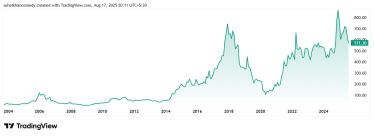 The share price of Siyaram Silk Mills Ltd was around Rs 147 in August 2020, and as on 20th August 2025, it was Rs 623, which is a jump of almost 324%. Rs 1 lac invested in the stock 5 years ago would have been close to Rs 4.25 lacs today.