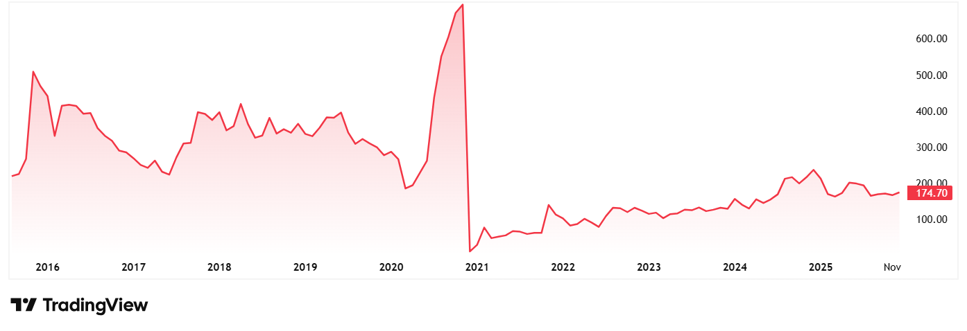 The share price of Aurum Proptech Ltd was around Rs 718 in December 2020, which has fallen to its current price of Rs 175 as on 12th December 2025.