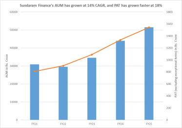 Since FY21, the lender’s AUM has expanded from just about Rs 30,000 crore to more than Rs 50,000 crore. Its PAT has increased even faster, registering an 18% CAGR growth from Rs 800 crore in FY21 to more than Rs 1,500 crore in FY25. In FY25, PAT grew by only about 6%. But excluding an exceptional gain of Rs 120 crore from the redemption of non-convertible preference shares of TVS holdings in FY24, PAT-growth was more respectable at 16%.