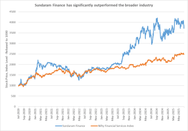 This explains the 63% CAGR return delivered by SHFL over the last 5 years. Sundaram Finance, on the other hand, has had a performance more in line with the NBFC industry. With a 30% CAGR since July 2020, Sundaram Finance has significantly outperformed the Nifty Financial Services Index’s 20% CAGR during the period.