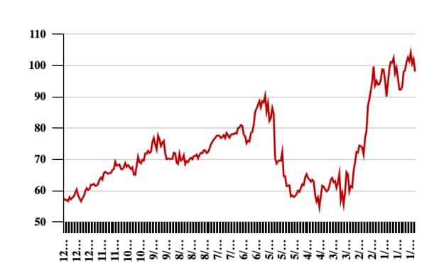 The stock touched its 52-week high of Rs 108 on 6 January 2025 and a 52-week low of Rs 52.70 on 7 April 2025.