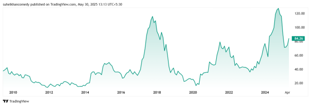 At the current price of 84, the stock is trading at a discount of 46% from its all-time high of Rs 159.